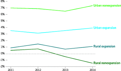 "In states expanding Medicaid, rural hospitals saw a greater increase in Medicaid revenue than urban hospitals did," Luthra writes. "City-based facilities save a higher percentage than rural hospitals with the reduction in uncompensated care, though that change did not translate into improved operating margins for urban hospitals." One likely factor is that rural hospitals serve more low-income people—who weren’t eligible for insurance before expansion, but have since been covered. Rural hospitals also are historically more likely to operate at a loss than urban hospitals.