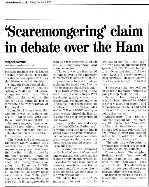 The Chairman raised concerns regarding the involvement of one of the Town Councillors in a newspaper article published in the Sidmouth Herald in respect to the future of The Ham, Sidmouth. Members agreed that acting as Trustees they would always wish to protect the Ham.